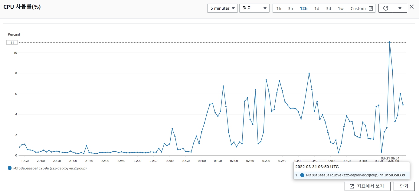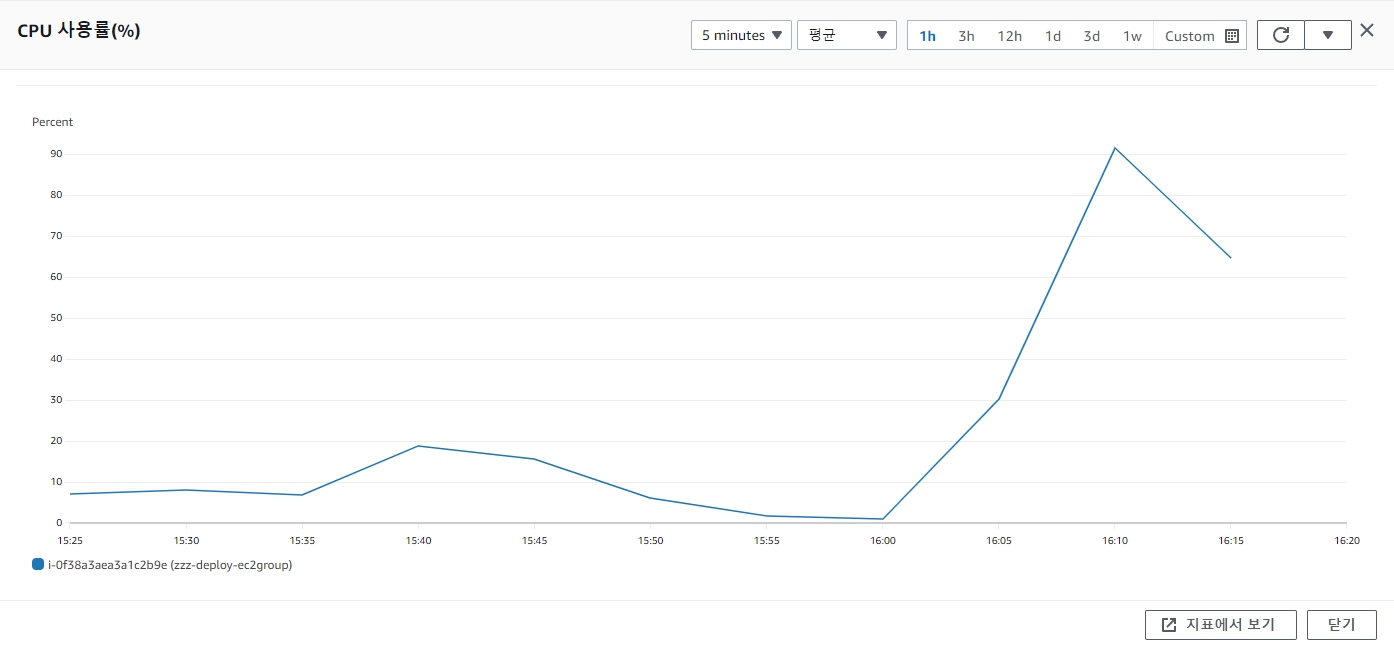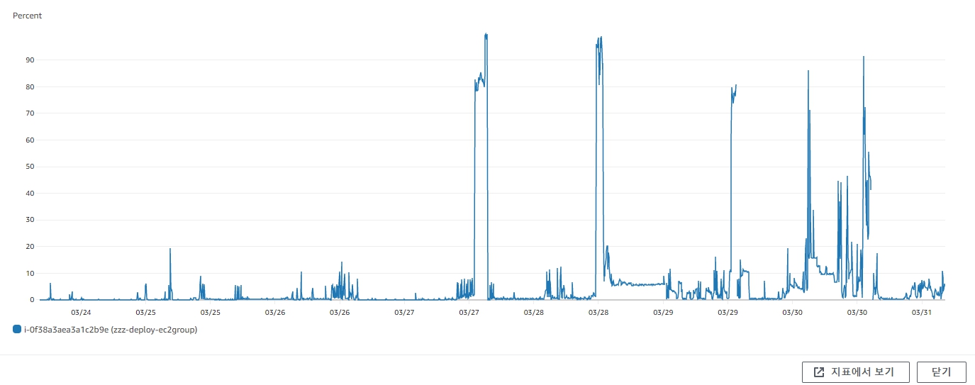 그런데 t3.micro로 변경후에는 JMeter로 1000명씩 1번 요청시 cpu 사용률이 15~20%으로 떨어졌다.