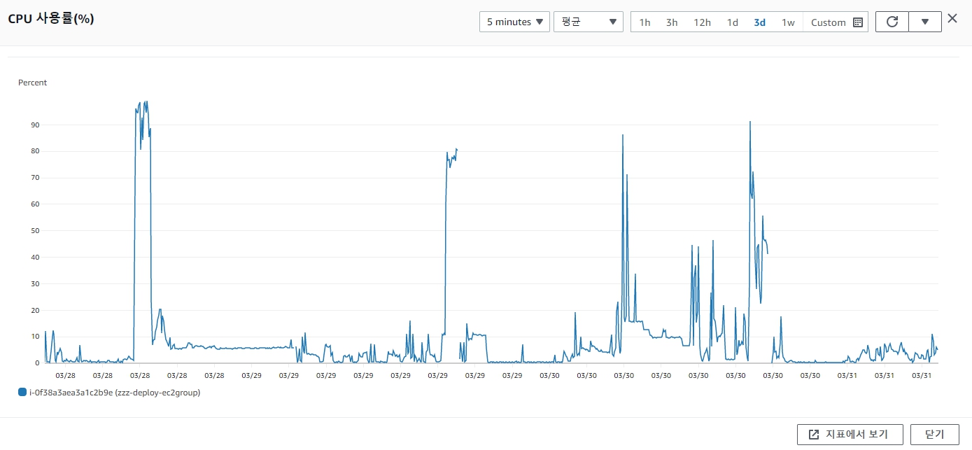 아까 t2.micro cpu:1기가, memory 1기가 에서는 JMeter로 450명씩 1번 요청시 cpu 사용률이 40~50%까지 올라갔었다.