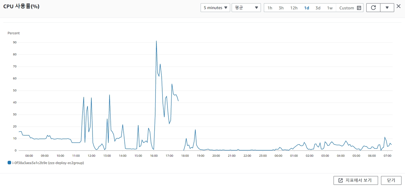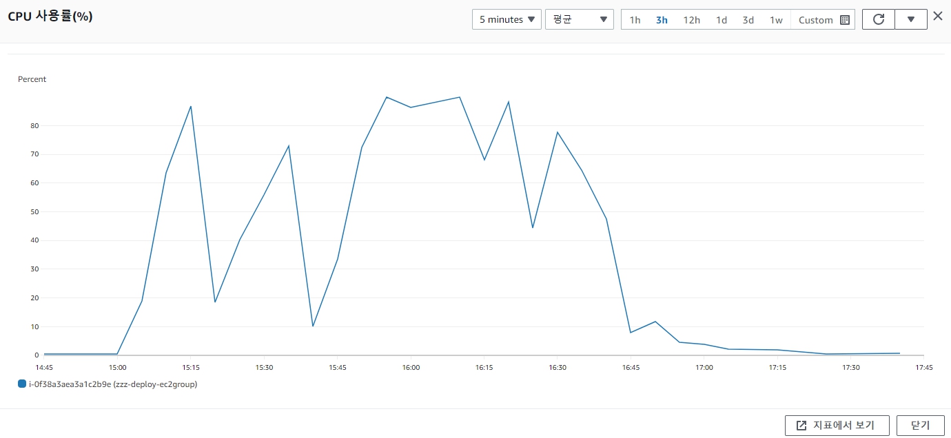 그런데 t3.micro로 변경후에는 JMeter로 1000명씩 1번 요청시 cpu 사용률이 15~20%으로 떨어졌다.