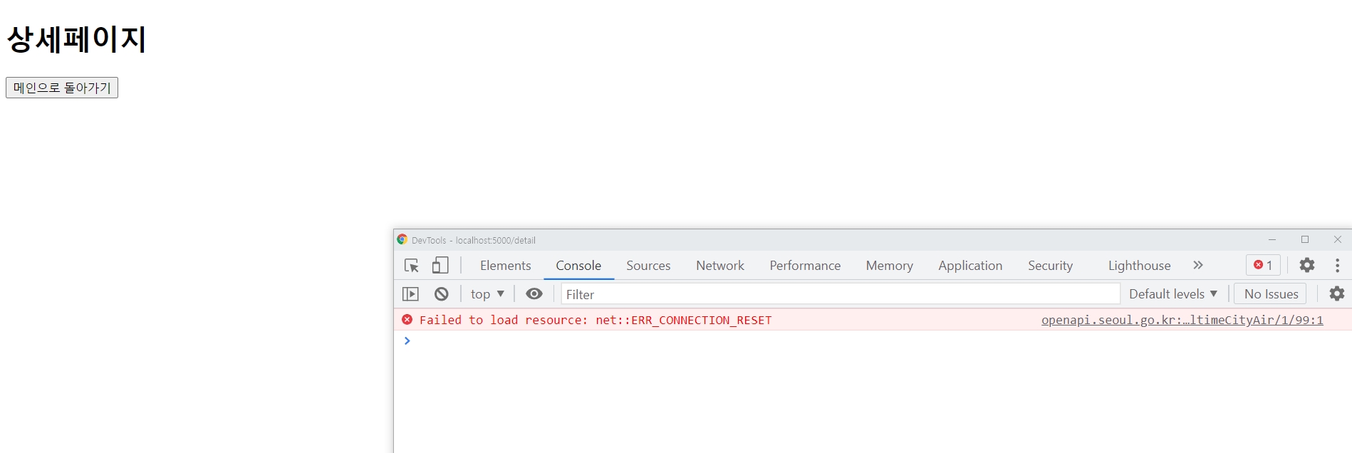 localhost:5000에서 개발자도구 console에 들어가면 서울시 api에서 미세먼지 정보가 잘 들어와야 정상이였다.