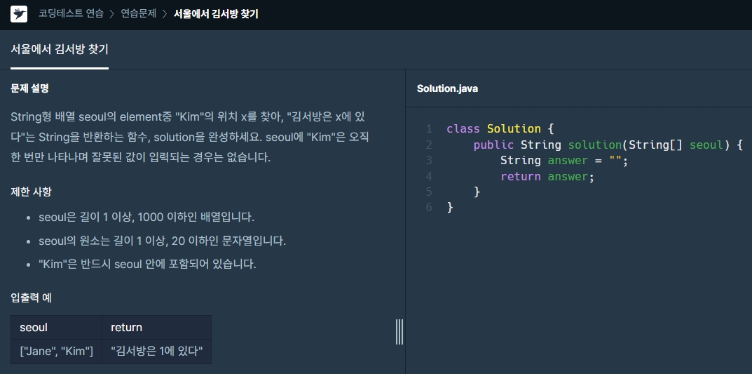 제한사항은 별로 중요하지 않고 배열 안에 Kim이 어디에 들어있는지만 확인하면 된다.