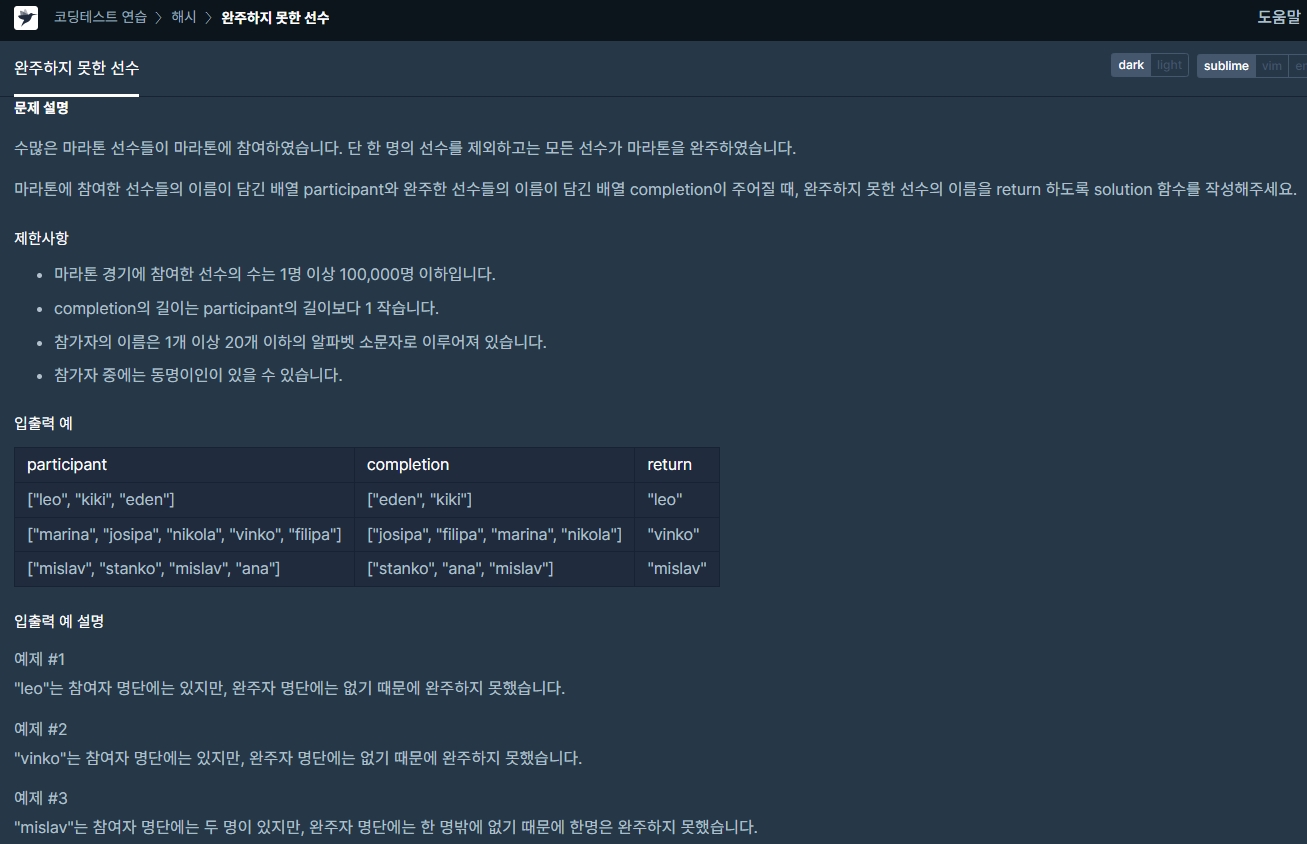 알고리즘 : 프로그래머스 : JAVA : 완주하지 못한 선수