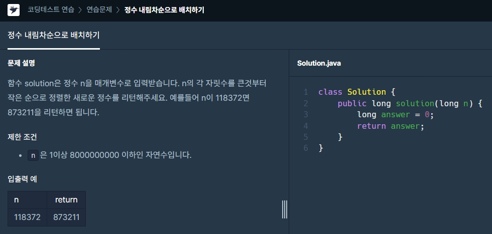알고리즘 : 프로그래머스 : JAVA : 정수 내림차순으로 배치하기