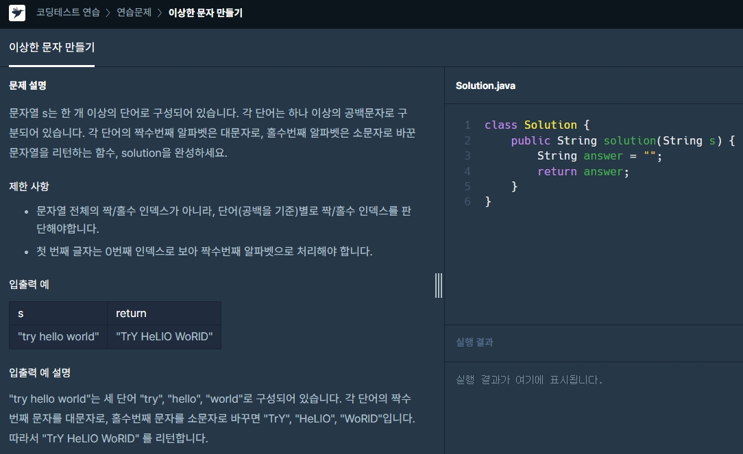 4. idx가 짝수이면 toUpperCase(); 함수로 대문자로 변경하고 idx가 홀수이면 toLowerCase(); 함수로 소문자로 변경합니다.