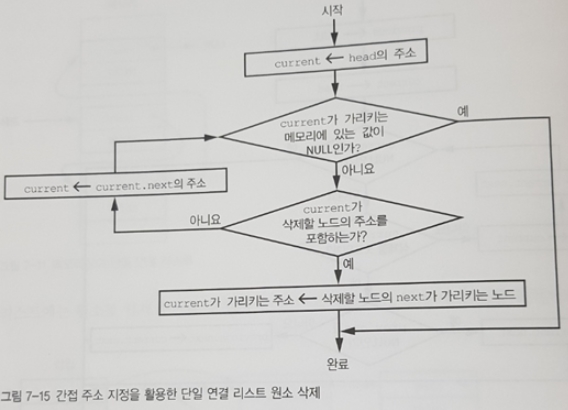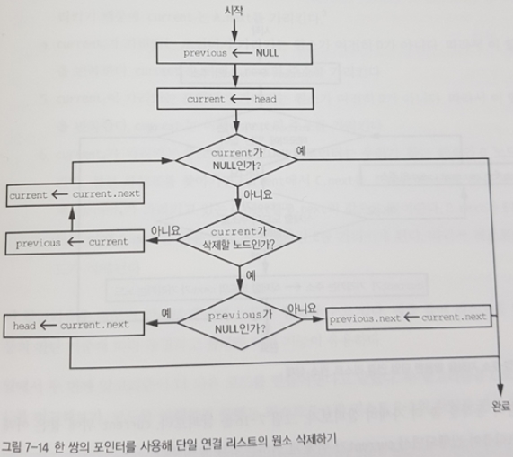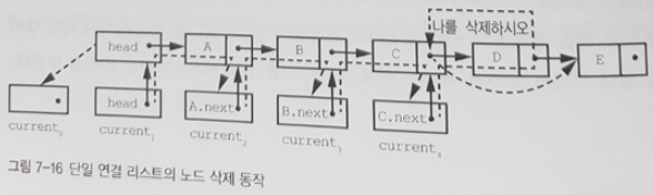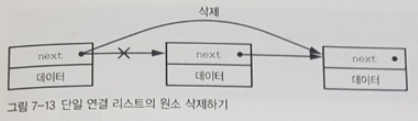 원소 삭제는 좀 더 복잡하다. 삭제할 리스트 원소의 바로 앞 원소의 next 포인터가 삭제할 원소의 next 포인터가 가리키는 원소를 가리키게 해야 하기 때문이다. 그림 7-13을 보라.
