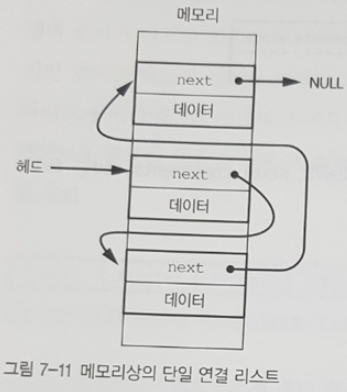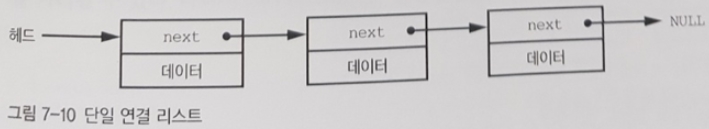 연결 리스트(linked list)는 목록에 들어갈 원소 개수를 모르는 경우 배열보다 더 잘 작동한다. 단일 연결 리스트는 그림 7-10처럼 구조체를 사용해 만들 수 있다.