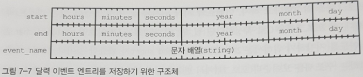 그림 7-7은 일시를 표현하는 구조체 한 쌍과 이름을 나타내는 문자열을 담기 위한 작은 배열을 함께 조합해 사용하는 모습을 보여준다.