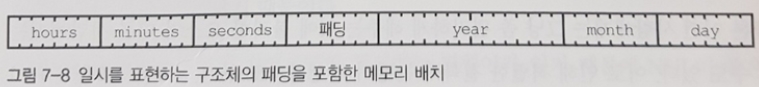 연도를 4번째와 5번째 바이트에 위치 시키면 경계에 걸치기 때문에 배치를 바꿔야 한다. 프로그래밍 언어 도구는 패딩(padding)을 필요한 만큼 추가해 이 문제를 해결한다. 일시 구조체의 실제 메모리 배치는 그림 7-8과 같다.