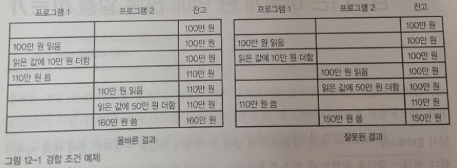 경합 조건은 2개(또는 그 이상)의 프로그램이 같은 자원에 동시에 접근하고, 자원 사용 순서에 따라 결과가 달라지는 경우를 뜻한다. 두 프로그램이 은행 계좌에 돈을 입금하는 경우를 보여주는 그림 12-1을 살펴보자.