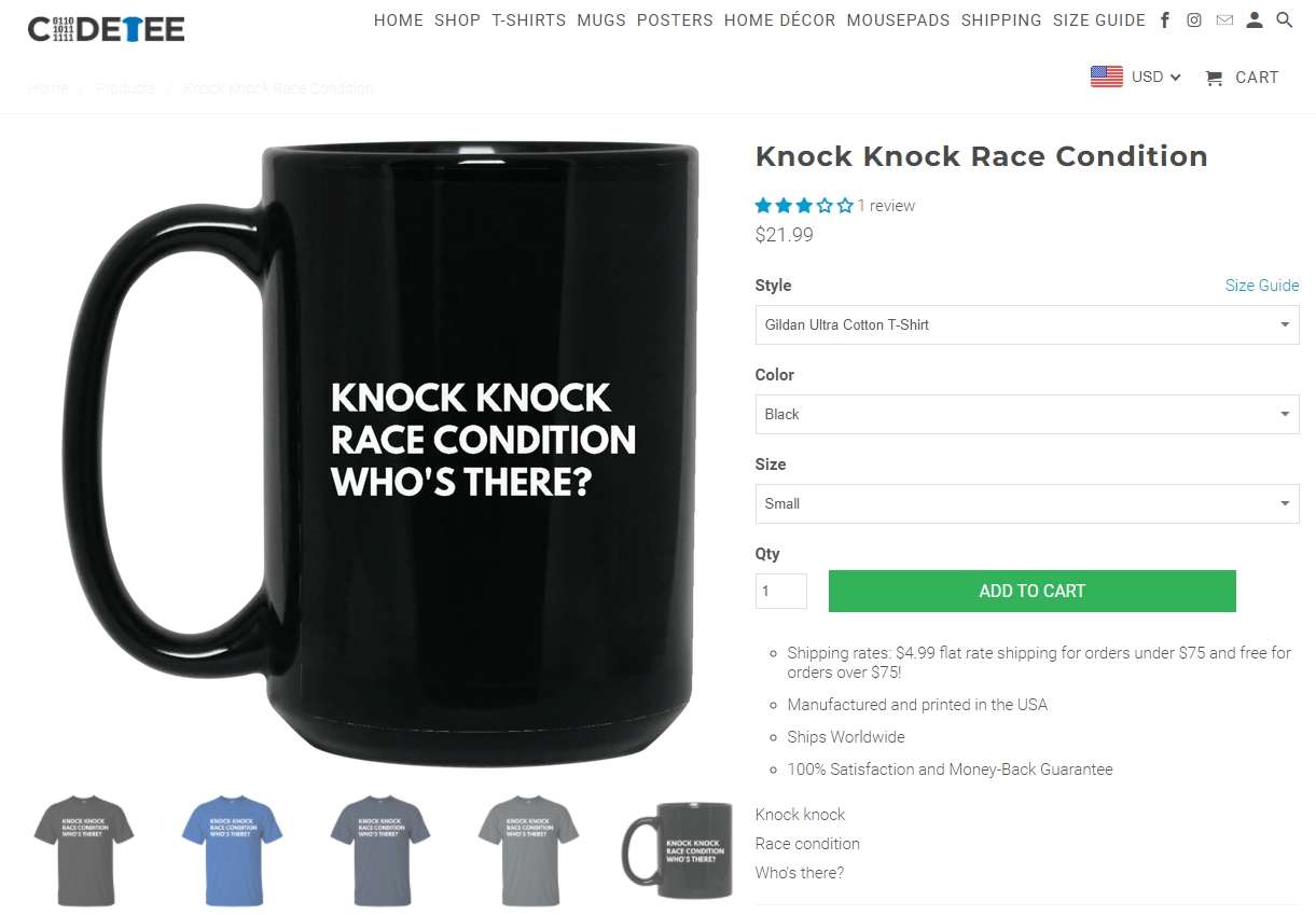 이 머그잔에서는 경합 조건이 발생하면서 "누구세요?"라는 질문이 나오기도 전에 바로 "race condition"이라고 이름을 답해버린 상황이다.