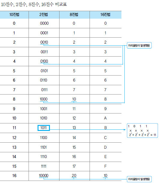 * 오른쪽 부터 1+1= 10에서 0을 내리고 1을 왼쪽으로 올린다. 2진수는 0과1만 표현되기 때문에 2라는 기호가 없고 1+1= 10으로 표현,