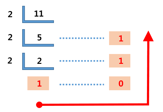 10진수 11을 2로 나눈 나머지를 2진수의 첫째자리에 오게 하고, 몫은 다시 2로 나누어 나머지를 2진수의 둘째자리에 오게하고 ... 마지막에 2미만이 된 몫을 2진수의 맨 왼쪽에 놓으면 된다.