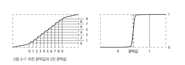 - 입력이 조금만 변해도 곡선의 가파른 부분 떄문에 출력이 확 달라진다. 이때 판정 기준을 문턱값(threshold)라고 부른다.