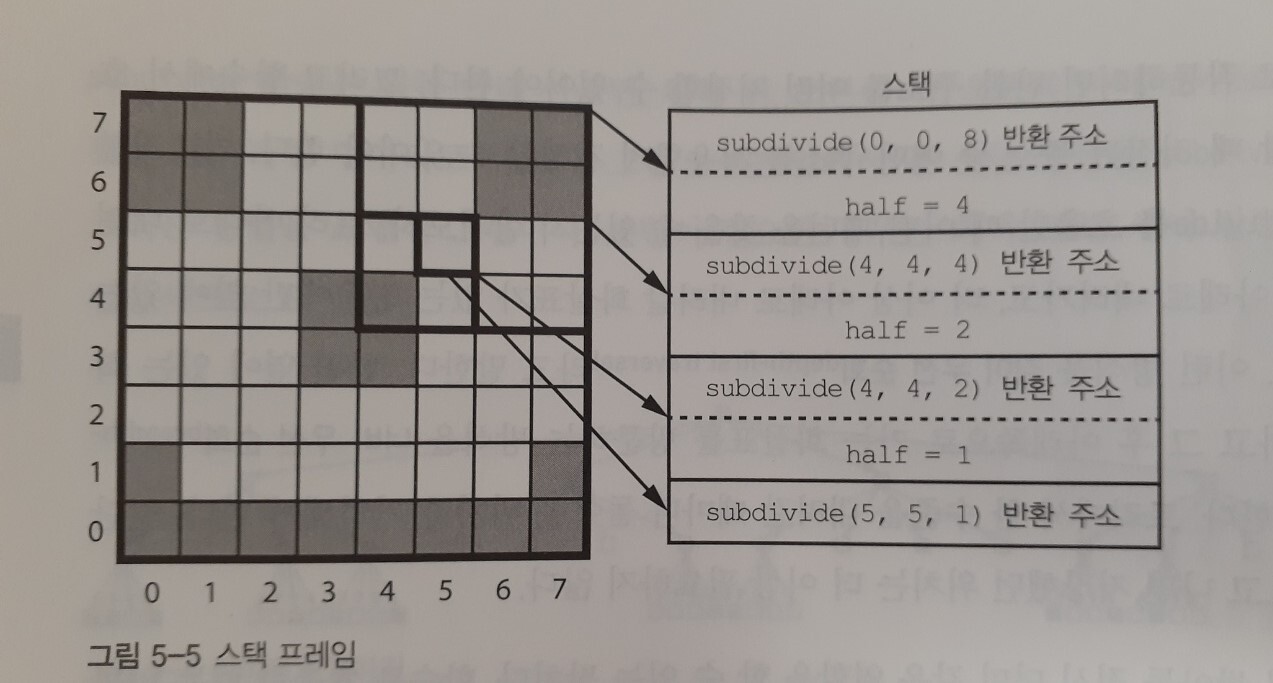 위에서 함수에서처럼 subdivide함수를 구현하면 문제가 생긴다. 반환값을 저장할 위치가 한군데 이기때문에 재귀적함수는 이미 들어 있던 반환값을 덮어써서 되돌아갈 위치를 잃어버리기 때문에 자기 자신을 호출할 수 없다.
