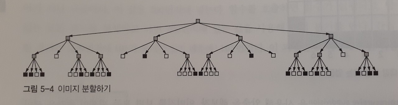 그림 5-4는 '트리'라고 불린다. 뿌리가 위에있는 뒤집어진 트리이다. 항상 각 노드에서 4개의 가지가 뻗어나가기 때문에 쿼드트리 이다.
